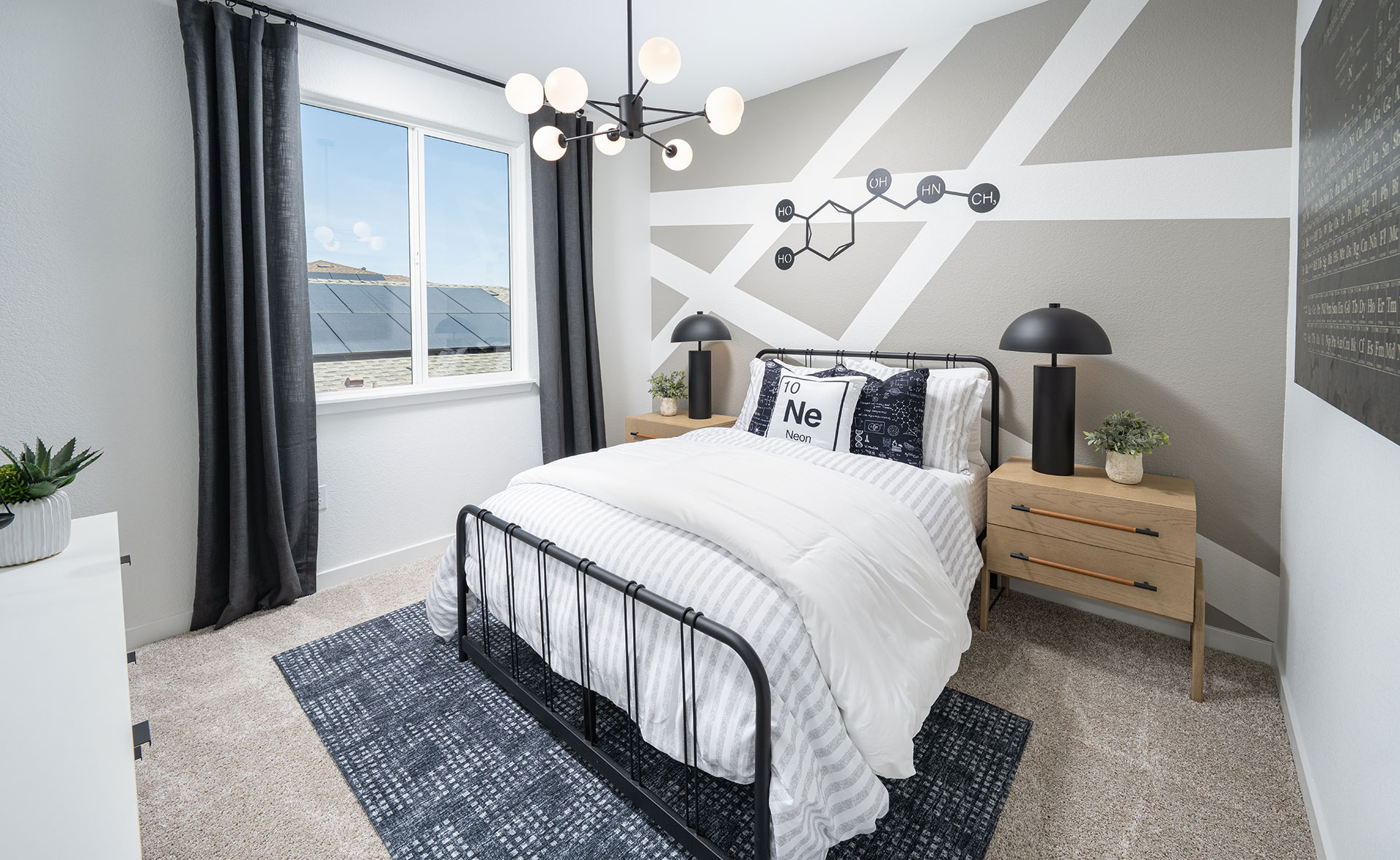 “With a home this size, it was important to me to showcase a variety of ages and life stages a homeowner might have. From nurseries to teen ages, I had a blast playing with themes that would complement the color scheme of this home. The raccoon room is my favorite—showing full well the power of some paint, fabric and a neon sign.”